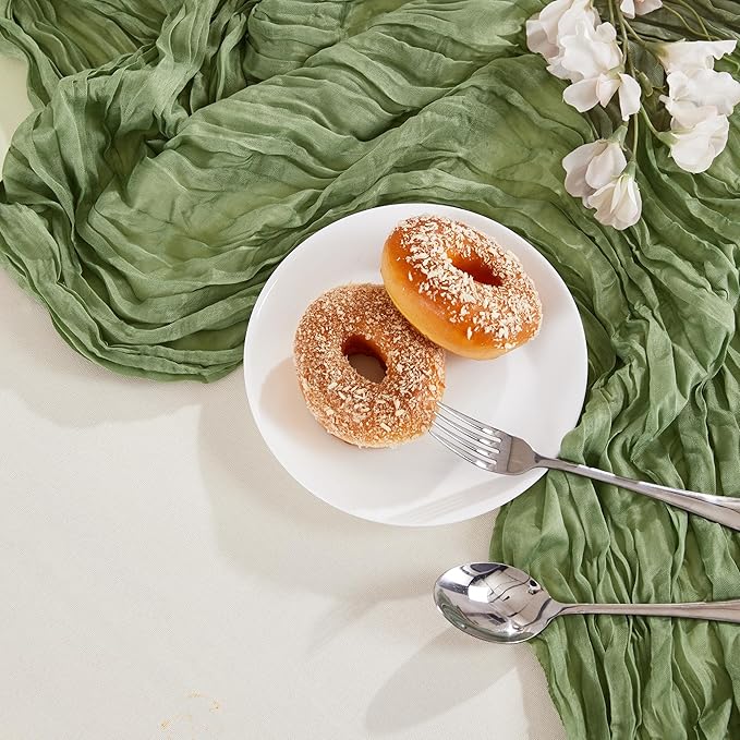 • PACKAGE INCLUDED: You will receive 6 pieces of sage green cheesecloth table runners. Elegant and beautiful design, exquisite workmanship. Product size: Each boho table runner is 35 x 120 inches. Enough to cover rectangles and round tables, as well as long tables that are stitched together. It can even be used to belt chairs decorate table napkins, background curtains. Round or square tables for 8-10 people, perfect for romantic and elegant party events