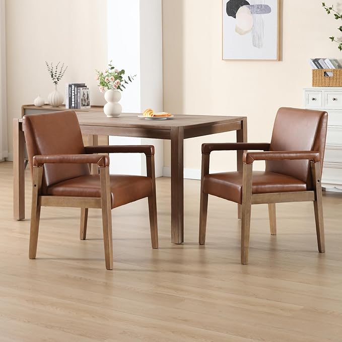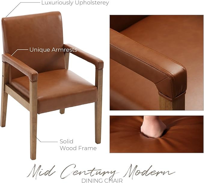 Mid Century Modern Dining Chairs Set of 4 Faux Leather Upholstered Living Room Side Chair, Kitchen Arm Chair with Solid Wood Legs for Home Kitchen & Restaurant, PU Brown