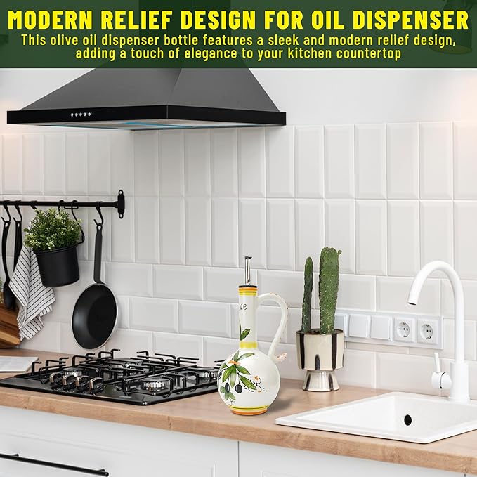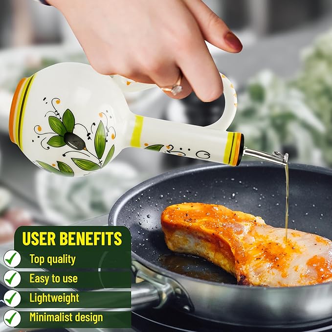 - Crafted With Ceramic: Each stoneware olive oil dispenser is made using durable and smooth ceramic that’s handcrafted and hand painted into a cruet bottle to keep your olive oil protected from UV rays, fresh, and ready to use while helping keep dust and bugs out