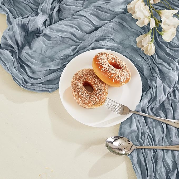 - PACKAGE INCLUDED: You will receive 24 pieces of dusty blue cheesecloth table runners. Elegant and beautiful design, exquisite workmanship. Product size: Each boho table runner is 35 x 120 inches. Enough to cover rectangles and round tables, as well as long tables that are stitched together. It can even be used to belt chairs decorate napkins, background curtains. Round or square tables for 8-10 people, perfect for romantic and elegant party events
