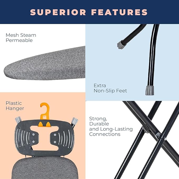 - ULTRA STURDT IRON REST: A dedicated iron rest provides a safe and secure place to place your hot iron, ensuring hassle-free ironing sessions without the risk of accidental burns or damage to surfaces.