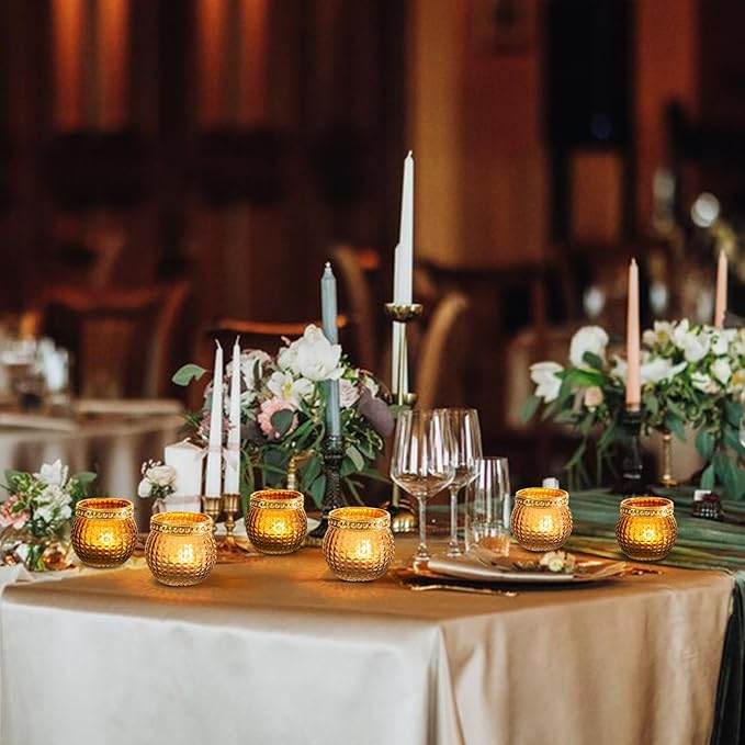 Amber Votive Candle Holders,Small Glass Tea Light Holder 12pcs,for Wedding Table,Vintage Boho Party,Holiday Centerpieces Fall Decorations
