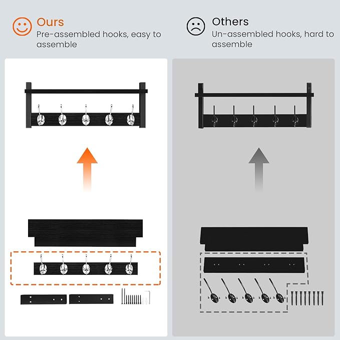 - QUICK AND EASY TO ASSEMBLE: Come with durable screws, anchors and easy-to-understand instruction, 5 hooks assembled on rail before package, pre- drilled holes for mounting brackets, the wall coat rack with hooks can be easily installed to the wall firmly
