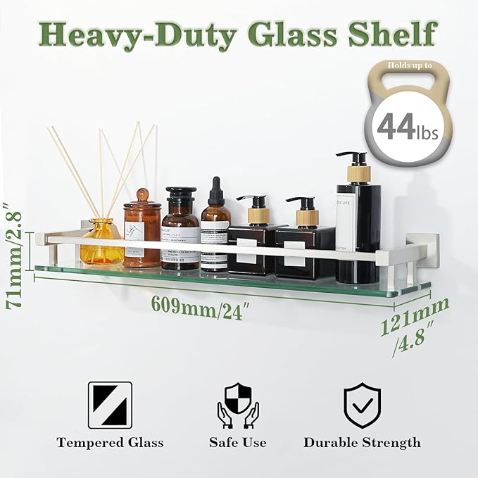- VERSATILE INSTALLATION:These glass shelving is easy to install with included hardware, suitable for a variety of settings including bathrooms, kitchens, and living rooms
