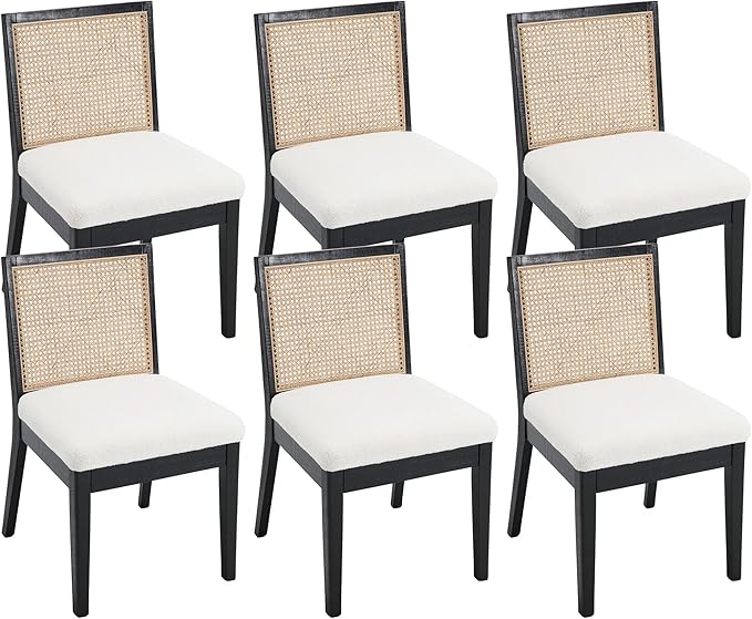 VESCASA Upholstered Dining Chairs with Square Rattan Back, Armless Padded Sherpa Fleece Cushion Dining Chairs with Wood Legs for Dining Room, Kitchen, Set of 6, Black Frame