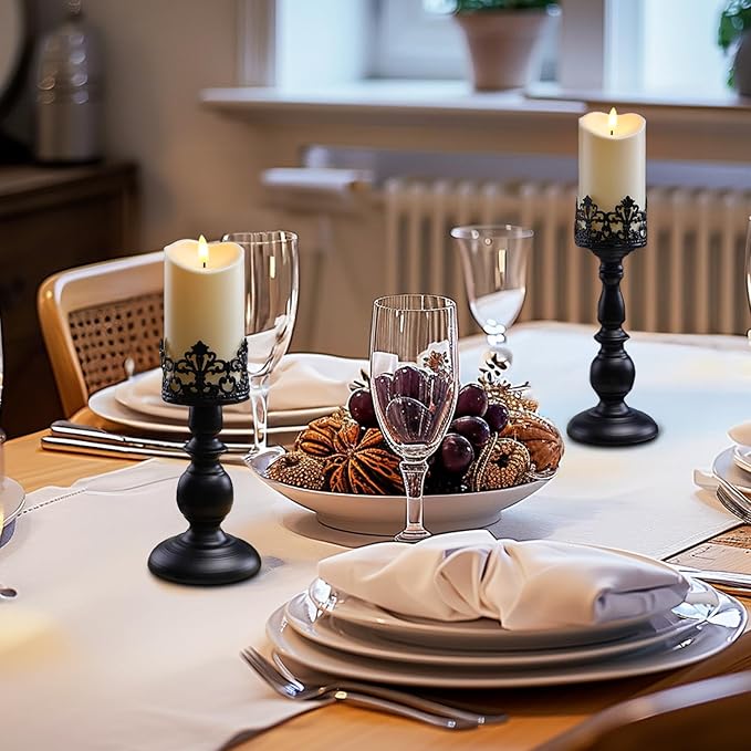 Homemory Black Halloween Candle Holders for Pillar Candles Set of 2, Gothic Vintage Candle Holders for Table Centerpiece, 11" 9" Tall Candle Stand Decorative for Dining Fireplace Living Room (Black)
