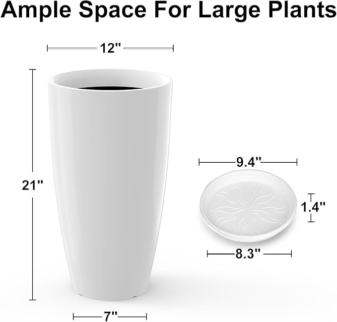Tall Flower Pot Indoor - Outdoor Plant Pot - White Glossy Planter - Elegant Ceramics Imitation - 12" Diameter 21" Tall with Drainage Holes and Saucer