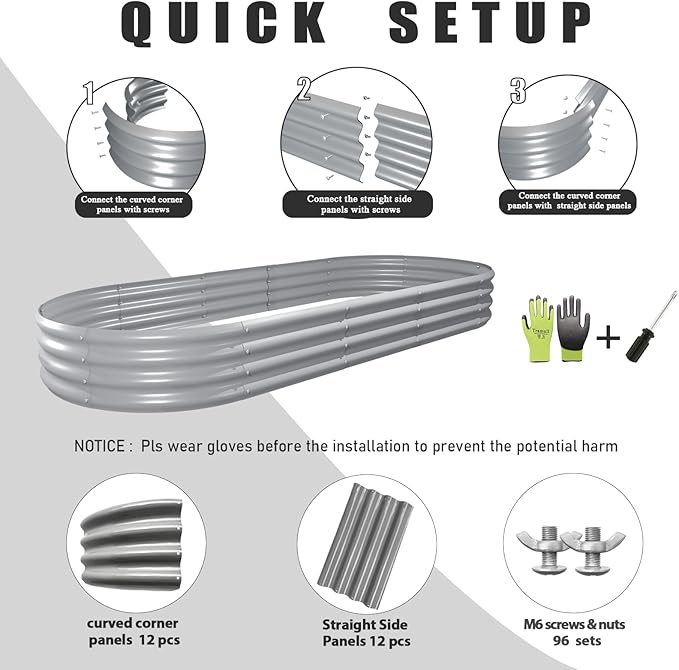 - 【Safety Features】①Anti-rust Coating, do not contaminate soil, safe for plants and humans; ②Oval shape, the raised planter box has rounded corner; ③Thickened crimped edge design, no sharp edges, smooth to the touch; ④ Gloves included; will not hurt your hand when installing or planting