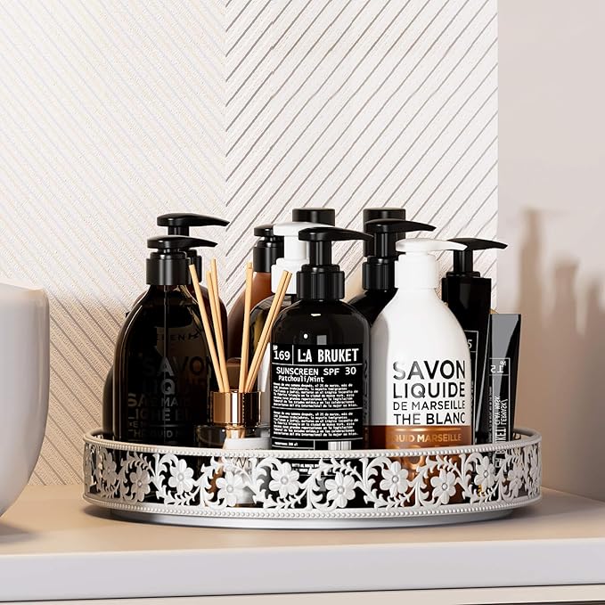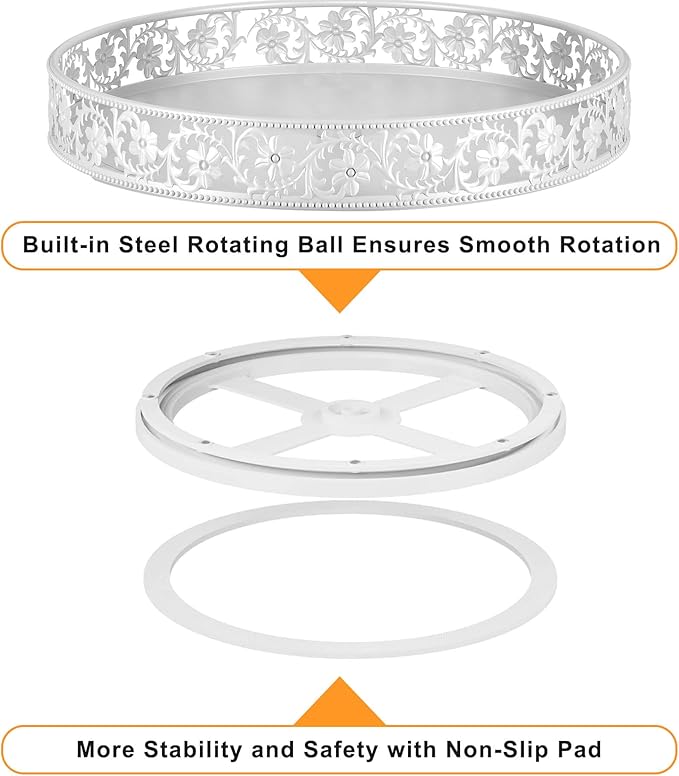 - 【Design with Floral Raised Edges and Open】The lazy susan for cabinet heightened edge with beautiful classic flower design not only provides exceptional decorative visual, but also prevents items from falling when rotating, it's safer to move the lazy susan organizer tray from one place to another.The open design of turntable organizer makes items clearly visible and easy to access and use.