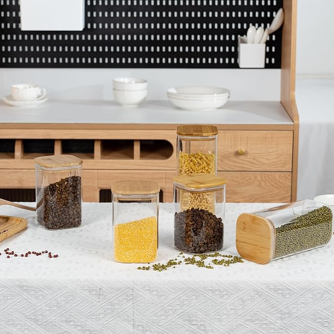 - [Transparent jar]- Transparent square glass containers make your items visible, allowing you to clearly see the contents of the glass storage jar and the remaining stock, and then you can easily replenish the food that is about to run out.