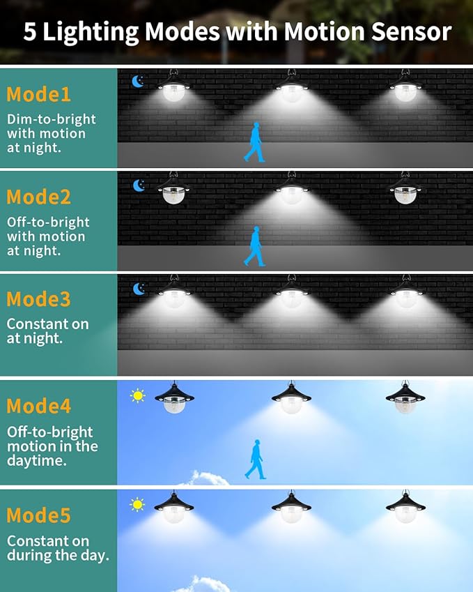- 【Daytime Available】This solar powered outdoor light works during the day, you don't have to wait until dark or cover the solar panel to work. Mode 4: Stays off and turns on for 15 seconds when motion is detected. Mode 5: Continuously on during the day. Can meet your different lighting needs.