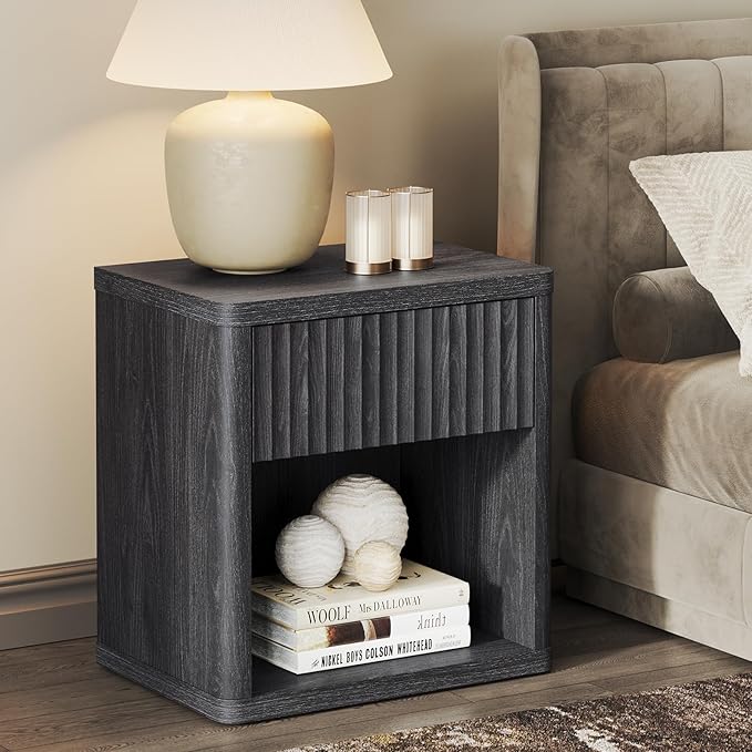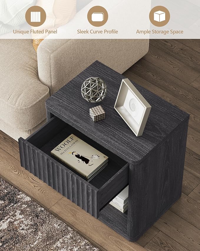 SICOTAS Night Stand Nightstand with Drawer Storage Fluted Bed Side Table End Table Large Modern Wide Bedside Mid Century Night Stands for Bedroom Living Room Sofa Couch Home Office, Dark Grey Alder