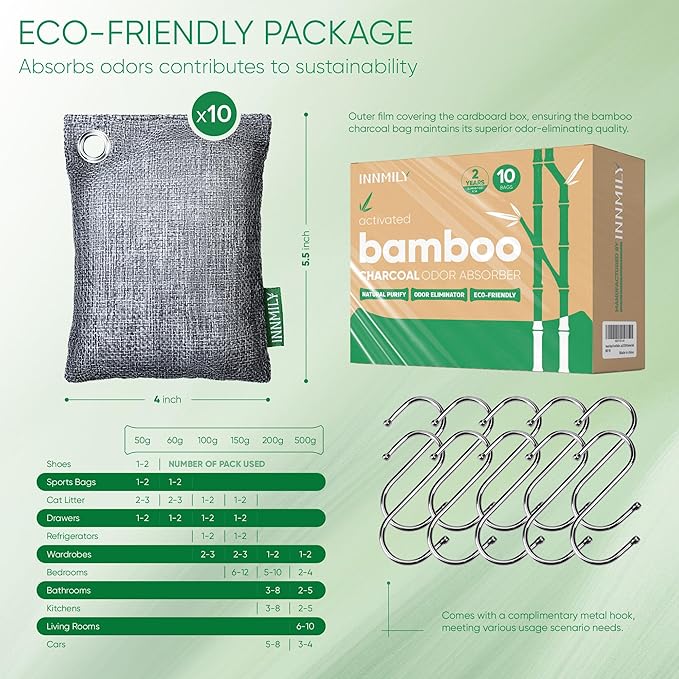 - TOGETHER, PLANTING A FOREST - We invite you to join us in tree-planting initiative - every purchase of Innimily bamboo charcoal air purifying bag, a tree will be planted in your name, let’s contribute to reforestation, aligning your well-being with environmental responsibility. natural solution that not only captures odors but also contributes to sustainability. Innmily home deodorizer bring fresh air, we offer no question asked money-back guarantee if you were not satisfied with the smoke absorber