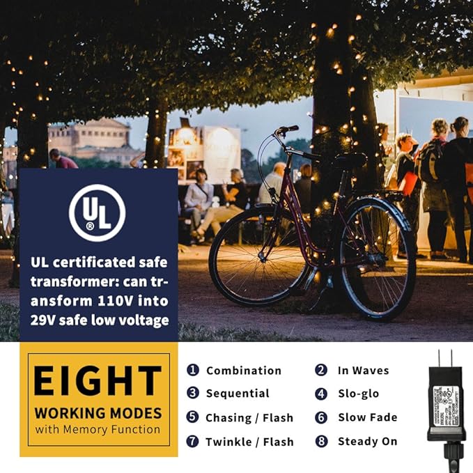 - 8 Lighting Modes With Memory Function:Our upgraded string lights with 8 different working modes: combination, in waves, sequential, slo-glo, chasing/flash, slow fade, twinkle/flash, steady on. The controller is designed to remember the last setting after cutting off the power. No need to set the light again.