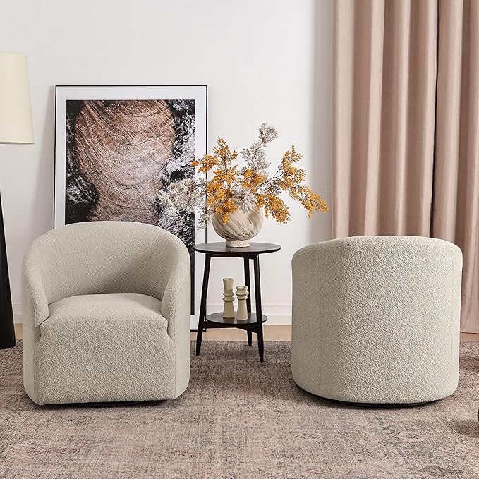 - SET OF 2 SWIVEL ACCENT CHAIRS: A set of two Swivel barrel chairs provides flexibility in terms of placement and usage. You can use them in various settings such as bedrooms, living rooms, and offices. They can be easily moved around and rearranged to suit your needs. Meanwhile, two chairs promote a more intimate and cozy setting, making it easier for people to engage in conversations. A pair of chairs can enhance the visual appeal of a room. They can serve as decorative elements, adding symmetry and balance to the overall design.