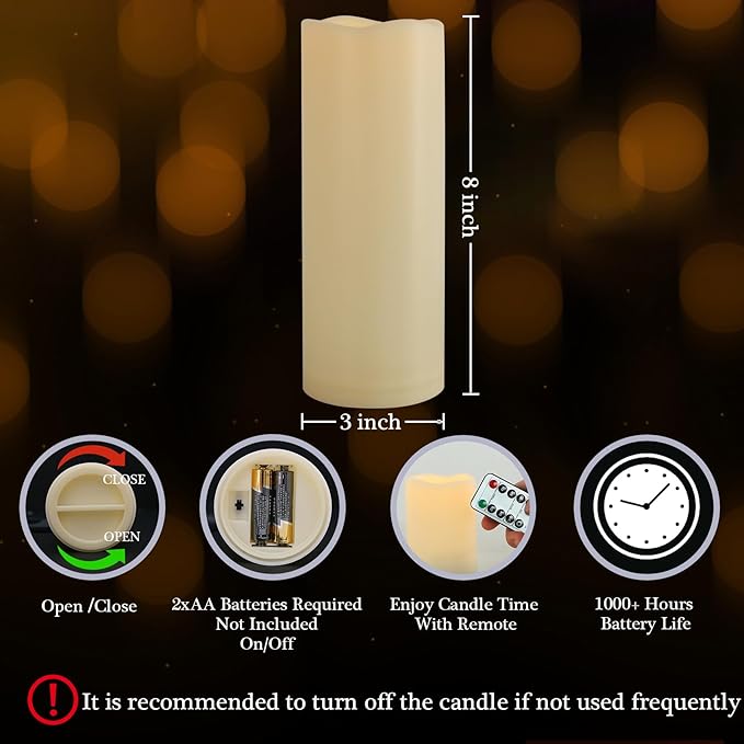 - Convenient Remote Control with Timers: When these battery operated flameless candles are placed where hard to reach, you can control them by remote within 50 feet. Set 2/4/6/8H timer easily then it will turn on automatically at the same time every day. Also you can adjust the light mode (flicker/steady glow) and brightness level as you need. The remote is required 2 AAA batteries (not included)