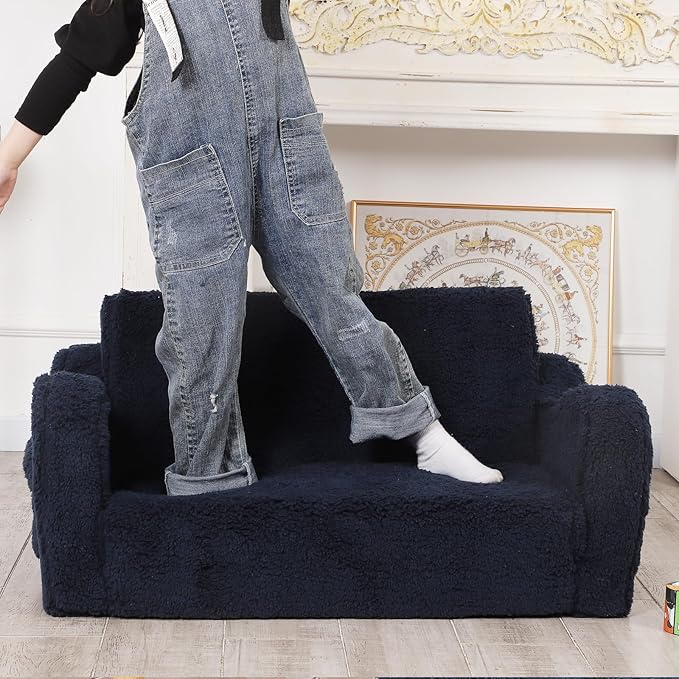 Kids Extra Wide Chairs for Toddler, 2-in-1 Toddler Soft Sherpa Couch Fold Out, Convertible Sofa to Lounger for Girls and Boys, Dark Blue
