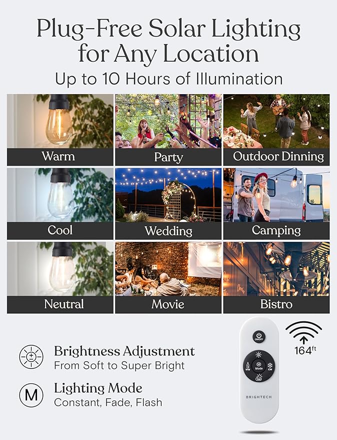 - Remote-Operated, Versatile Solar String Light: The LED string lights can be used at backyard weddings, parties, and birthdays. Install the lights by placing the solar panel outdoors with included stake and clip. The lights strand also comes with a remote control for your convenience, so you’re not limited to close distance control, and you can choose between 3 color temperature options. All 3 settings are dimmable, making our solar string lights a great choice for any occasion!