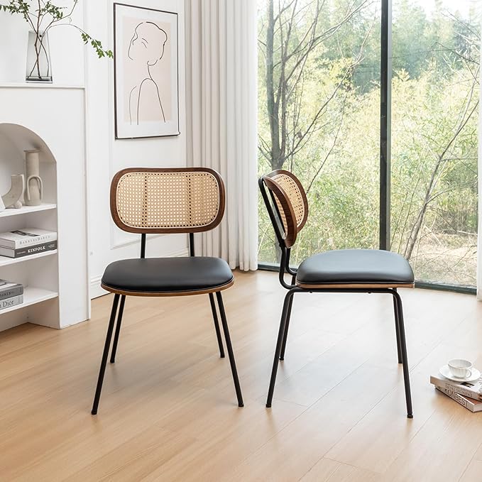 Rattan Dining Chairs Set of 2, Mid Century Modern Dining Chairs with Cane Back for Kitchen Dining Room, 19 Inch Faux Leather Black
