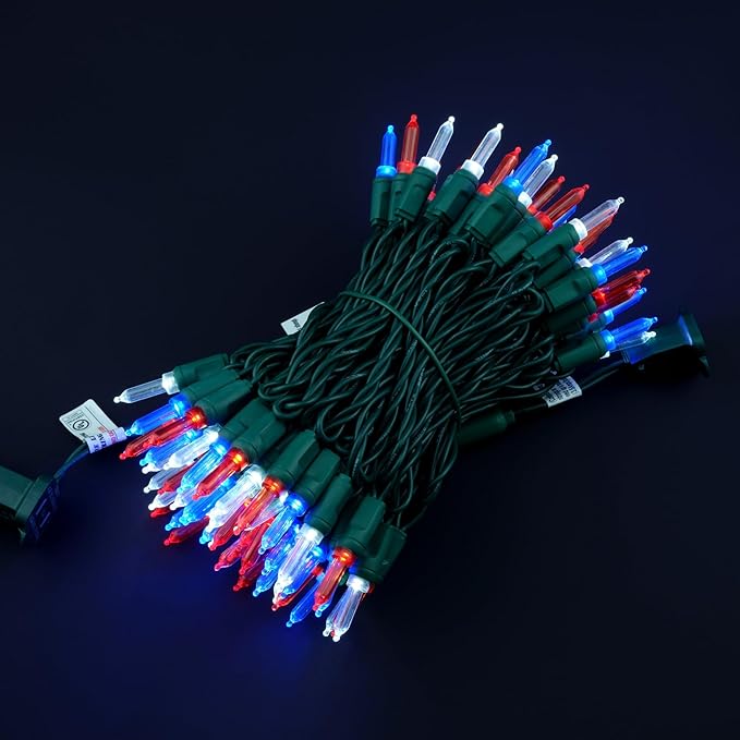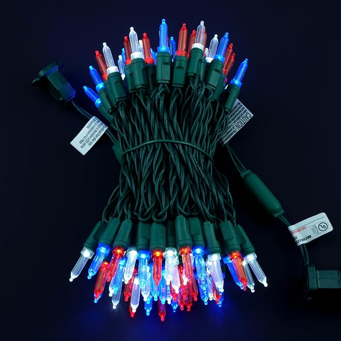 100 Red White Blue One-Piece LED Christmas Lights, 33 ft Green Cord High Waterproof UL Certified Patriotic Outdoor String Lights (Red White & Blue)