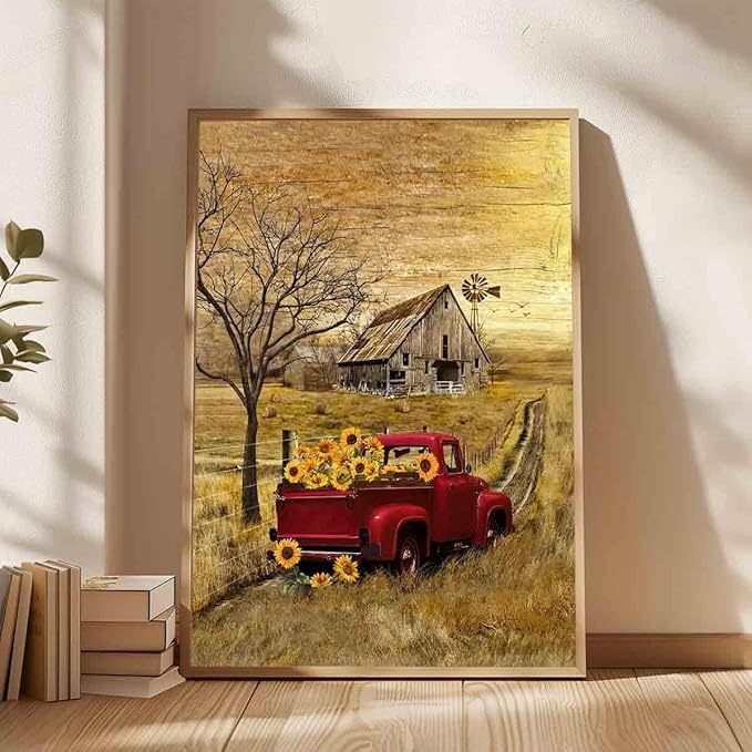 Barn Prints Farmhouse Old Barn Vintage Farmhouse Canvas Wall Art Red Truck Wall Art Old Truck Red Canvas House Pictures Wall Decor Old Barn Sunflower Pictures 16x24inch No Frame