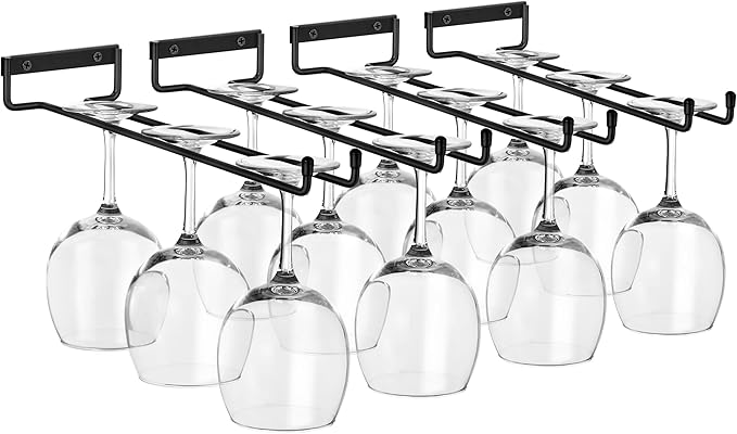 - Under Cabinet Wine Glass Rack (4 Pack): Mounts directly under cupboard for visible storage of your glassware - Stores 3 of your favorite stemmed wine glasses or 4 champagne glasses per rack depending on the size - Can also be used as a mug shelf for mug storage - Use display shelf to organize your choice of glassware, china storage, bar wall decor, wine glass storage, and more