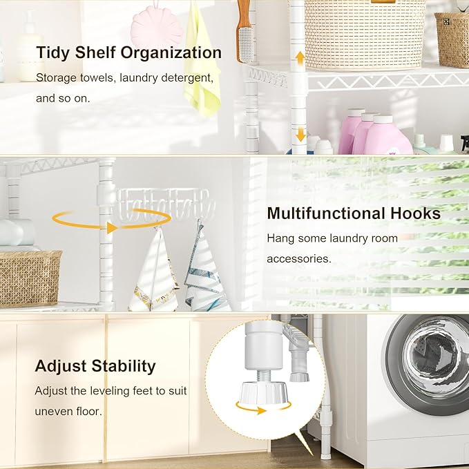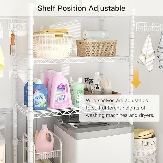 - Space Saver: The adjustable wire shelves for storing and organizing daily laundry room accessories, like towels, washing powder, washing liquid, and laundry beads. It also can be adjusted to any height you want to suit different height washing machines