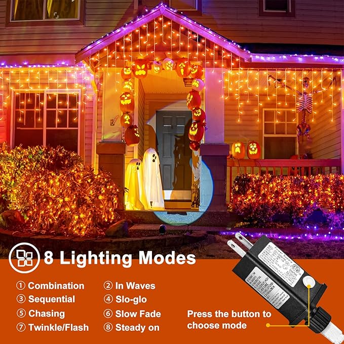 - Upgraded 8 Modes Halloween Lights: The icicle Lights have 8 selections of light pattern: 1.Combination 2.In Waves 3.Sequential 4.Slo-Glo 5.Chasing/Flash 6.Slow Fade 7.Twinkle/Flash 8.Steady On. Different lighting effects are controlled by the button on the plug. These beautiful and vibrant outdoor lights will bring you a lot of festive atmosphere.