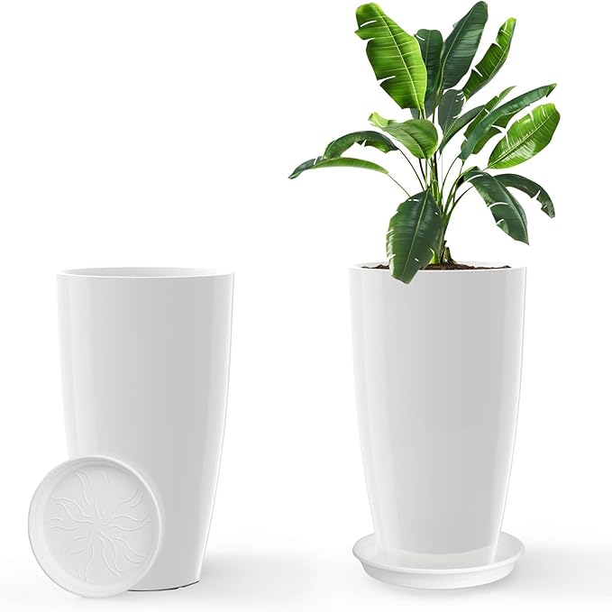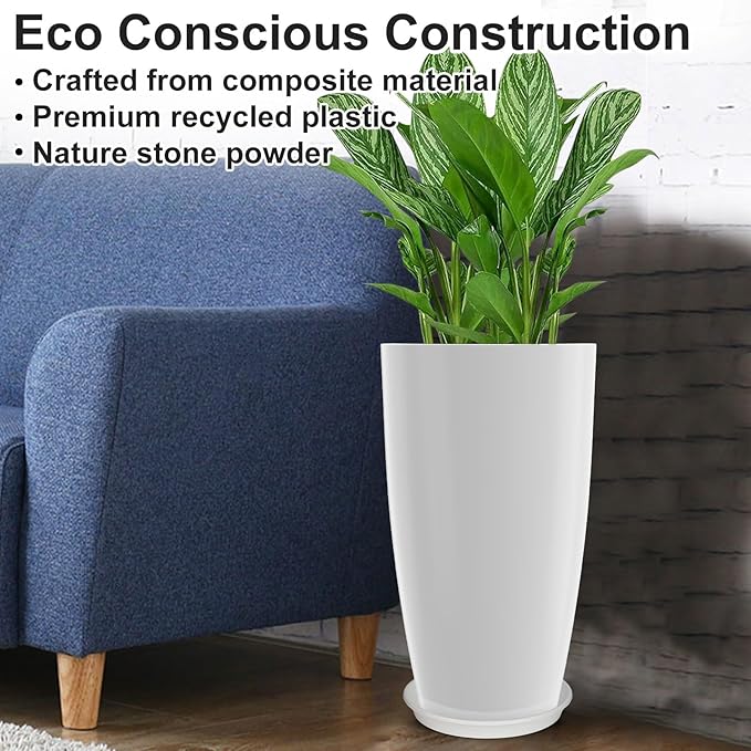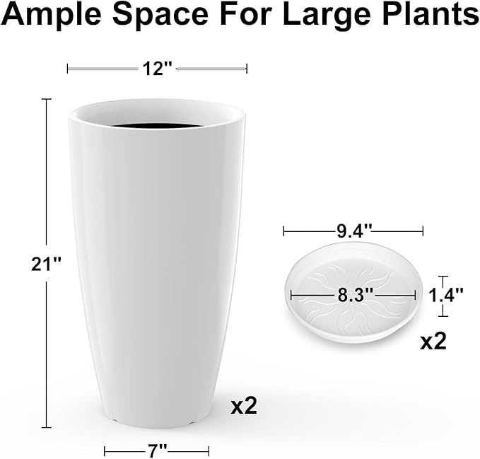 Tall Flower Pot Indoor - Outdoor Plant Pot - White Glossy Planter - Elegant Ceramics Imitation - 12" Diameter 21" Tall with Drainage Holes and Saucer