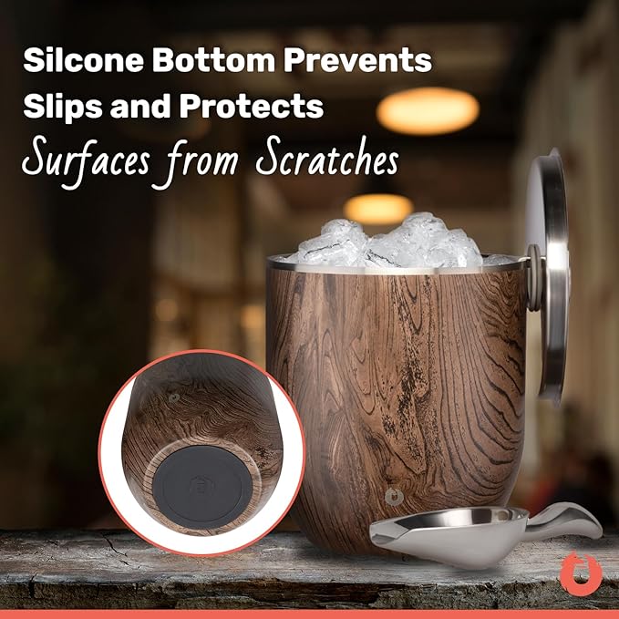 - Timeless Style: The last ice bucket you’ll ever need, and frankly, ever want. Our beautiful 3-liter bucket uses insulated stainless steel so your ice and drinks stay refreshingly cold. The ‘floating’ lid with side holder, includes metal ice scoop, and rubber base making it fun to use while mixing your guests’ favorite cocktails. Bring it to the patio or cookout—the outside is condensation-free so it’s easy to carry. A must-have home entertaining bar accessory, and a treasured gift.