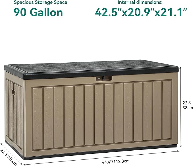 - Large 90-Gallon Capacity: The patio storage box measures 44.49''L x 22.83''W x 22.83''H, spacious enough to store various items such as cushions, tools, supplies