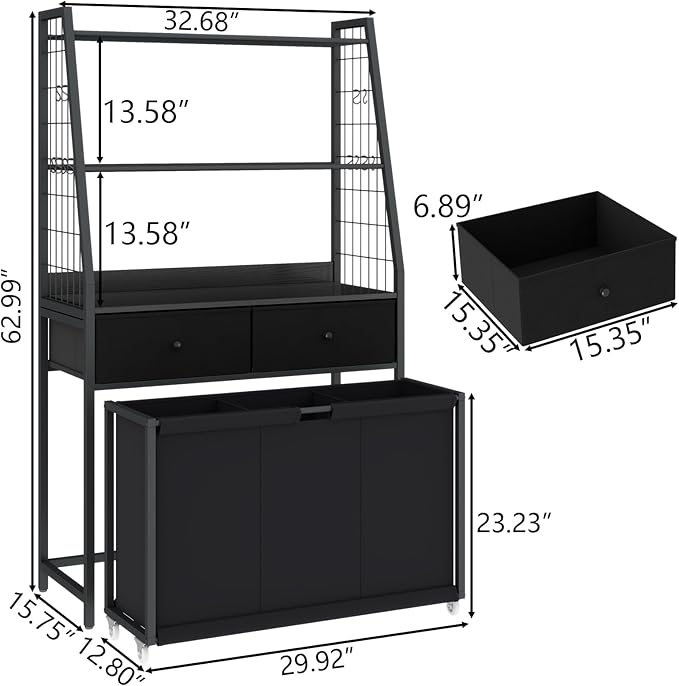 - [Extra 2-Tier Shelf for Laundry Sorter] The featured 2-tier shelves not only add an element of elegance and sophistication but also provide a convenient platform for your detergent or fabric softener. As the laundry sorter gets filled, the top shelf stands as a vigilant sentinel, preventing any attempt at escape. The several removable hooks are specially designed to hold brushes and wet towels.
