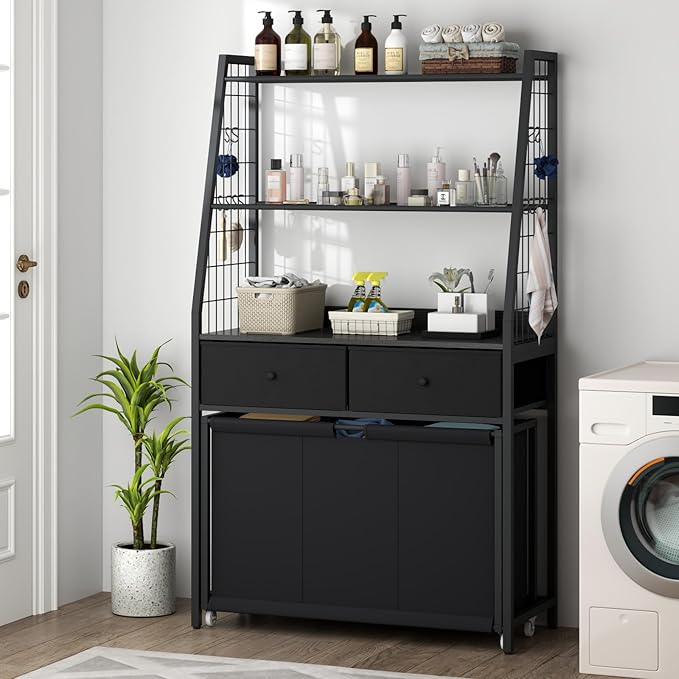 Laundry Hamper Laundry Basket with 3 Section Pull-Out Rolling Bags & 2-Tier Storage Shelf, Laundry Sorter for Organization and Storage with 2 Drawers for Laundry Room, Bathroom
