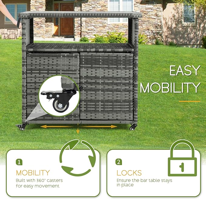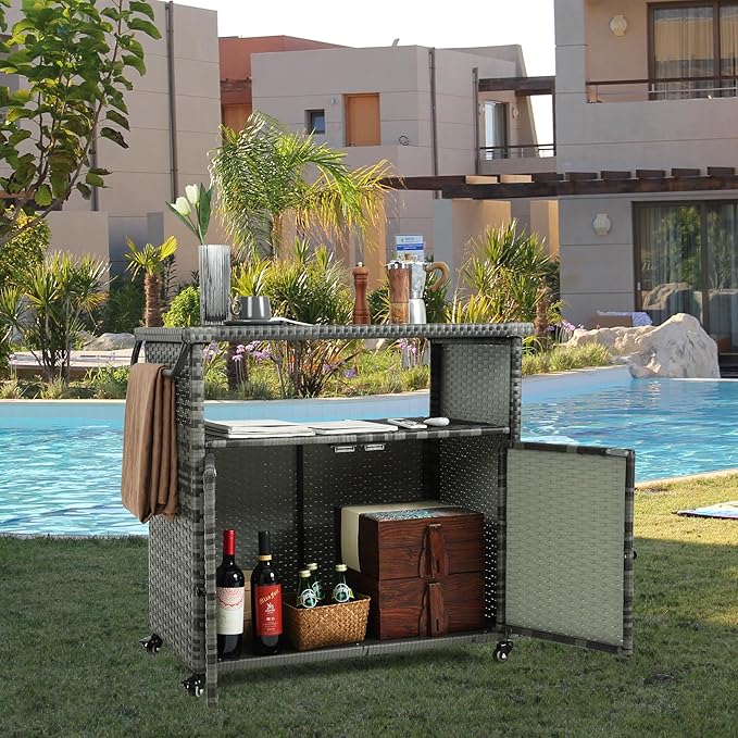 - MULTI-PURPOSE FUNCTION: This wicker bar is versatile for indoor kitchens, dining areas, or as a barbecue table, outdoor bar, serving trolley, or kitchen island. Its flexible design makes it an ideal outdoor entertainment center