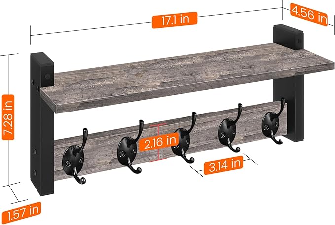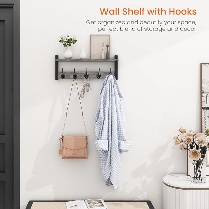 - 2-IN-1 DESIGN: The 4.52" deep floating shelf provides ample space for decorative items while featuring 5 dual metal hooks for practical hanging storage in your entryway or hallway. Showcase photo frames, a potted plant, or decor on the upper shelf