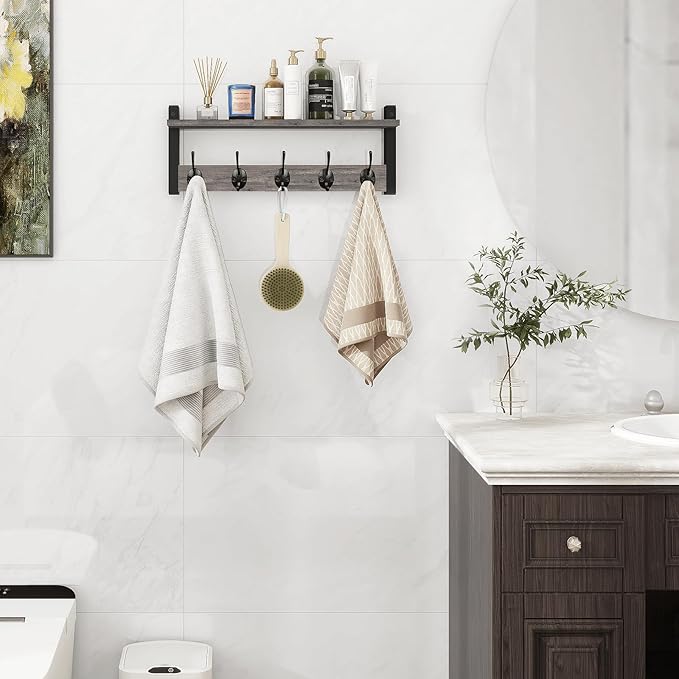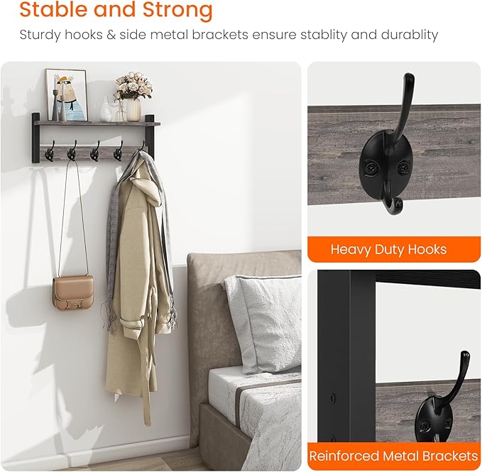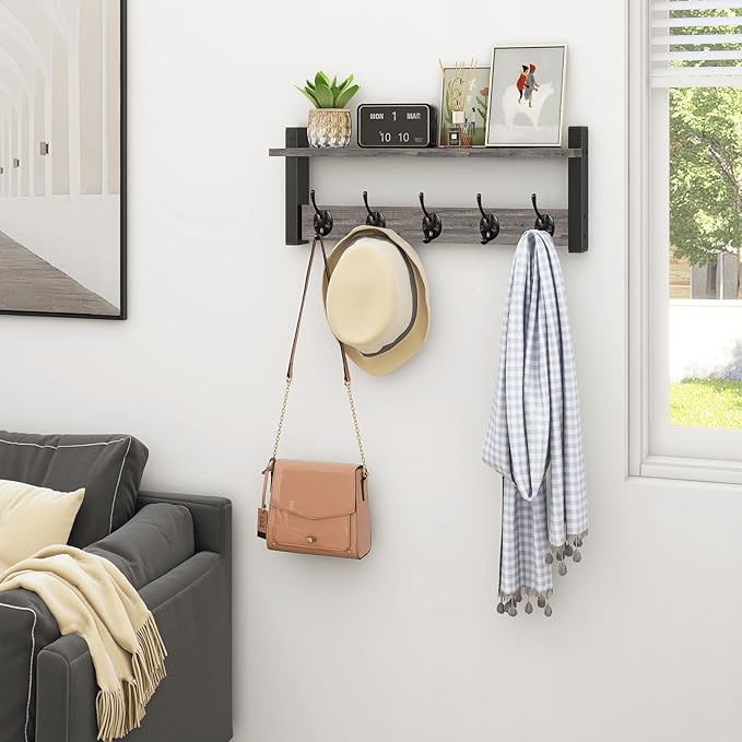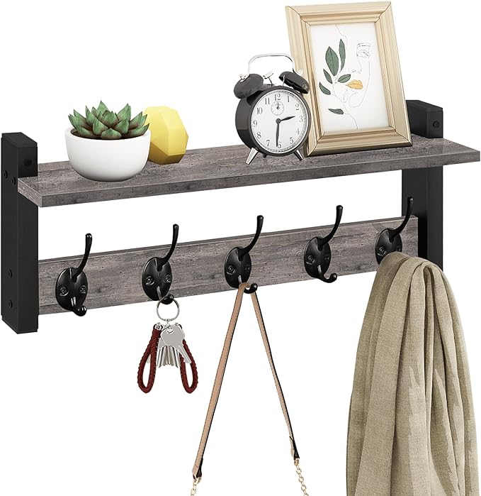 Homode Wall Hooks with Shelf, Coat Rack Wall Mount, Entryway Shelf with Hooks for Clothes, Backpack, Key, Purse - Rustic Grey