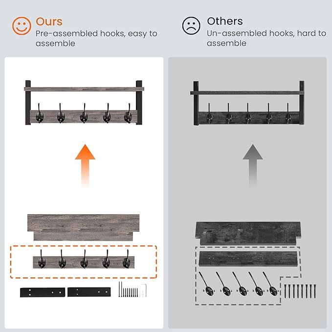 - QUICK AND EASY TO ASSEMBLE: Come with durable screws, anchors and easy-to-understand instruction, 5 hooks assembled on rail before package, pre- drilled holes for mounting brackets, the coat rack with shelf can be easily installed to the wall firmly
