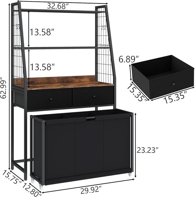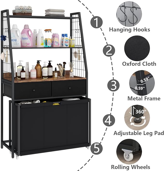 - [Extra 2-Tier Shelf for Laundry Sorter] The featured 2-tier shelves not only add an element of elegance and sophistication but also provide a convenient platform for your detergent or fabric softener. As the laundry sorter gets filled, the top shelf stands as a vigilant sentinel, preventing any attempt at escape. The several removable hooks are specially designed to hold brushes and wet towels.