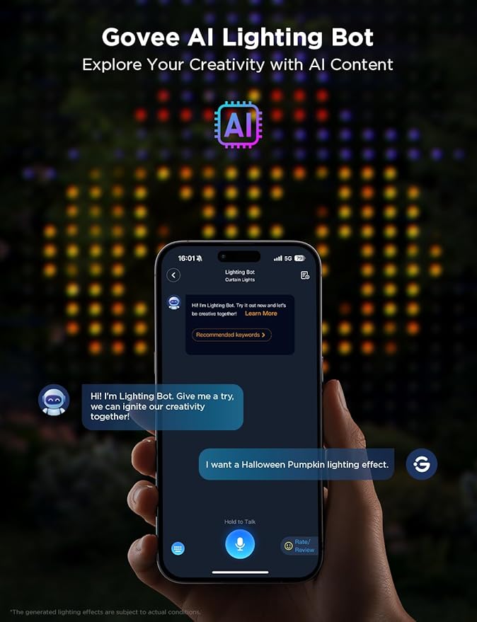 - Govee AI Lighting Bot: Enhance your creativity with the unshackled power of Govee AI Lighting Bot. Breath life into designs using AIGC, with both text and voice prompts, providing JPG lighting effects.
