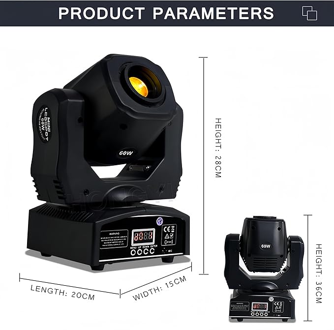 - Moving head light powered by a 60W cool white LED engine, stable output, color wheel and gobo wheel create a variety of stage lighting effects; 8 Gobos + Gobo shaking + Gobo rotation, 8 colors + half-color effect + color rotation (the speed of change can be adjusted)