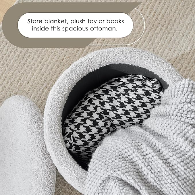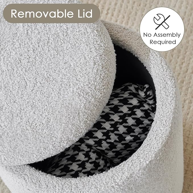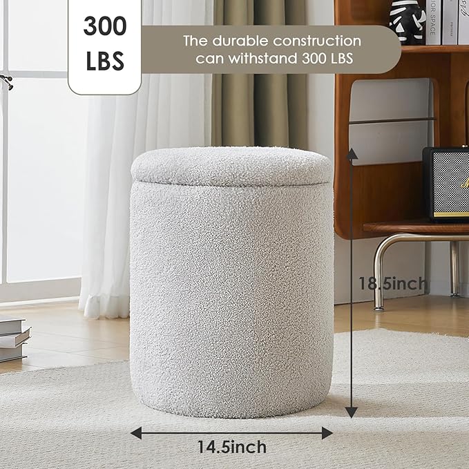 YFO Round Ottoman with Removable Lid Upholstered, Multifunctional Vanity Chairs for Makeup, Soft Footrest Stool Ottoman Foot Stool for Living Room, Bedroom, Boucle, Grey