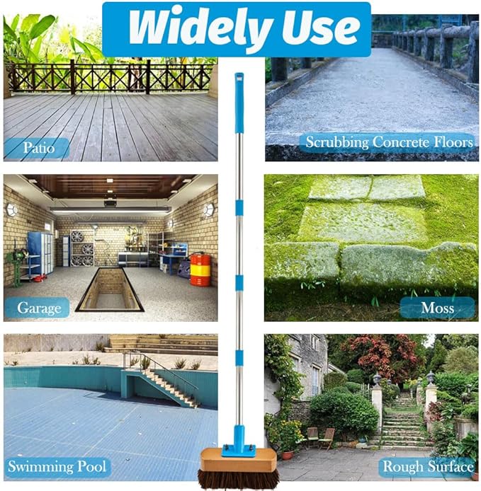 - HEAVY DUTY DECK BRUSH: The outdoor deck brushes for scrubbing heavy duty is consist of high-quality wooden base, dense natural palmyra bristles, paired with 4 stainless steel poles. Easy to install and disassemble, doesn't take up space. Best moss and dirt remover tool from rough surface. Ideal heavy duty deck brushes for scrubbing outside