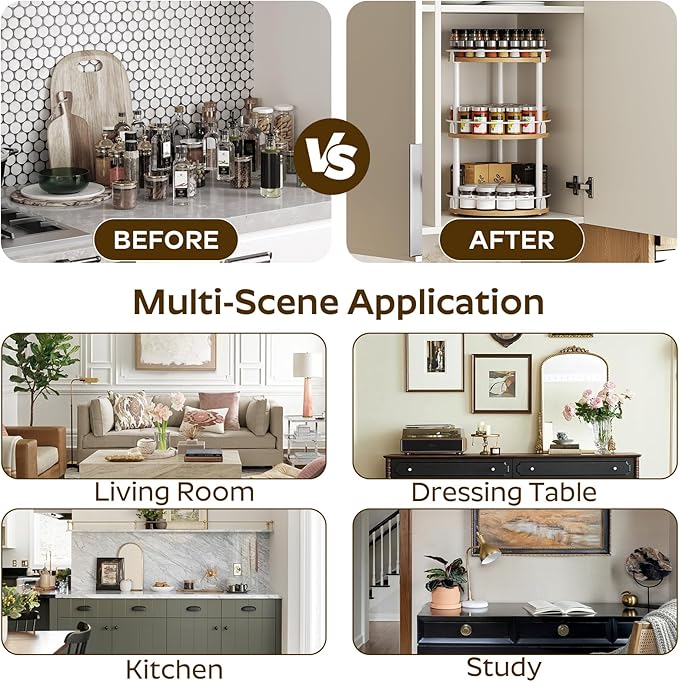 - Reduce Countertop Pressure: It is multifunctional. On the kitchen countertop, it keeps spice jars close at hand to make cooking fun. On the vanity table, it holds your beloved pieces. At the dinner table, you can easily "spin" to get your favorite