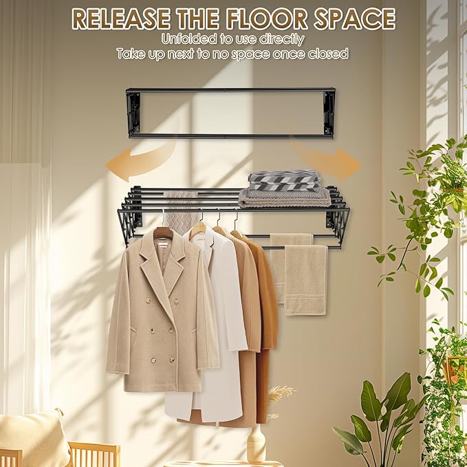 - 【Space-Saving Expandability】The wall mounted clothes drying rack can be folded and stored on the wall when not in use, make you turn your empty wall into a useful drying spot, saving valuable floor space and making clothes drying easy. When unfolded, it offers ample room for all types of clothing while keeping your laundry area organized.
