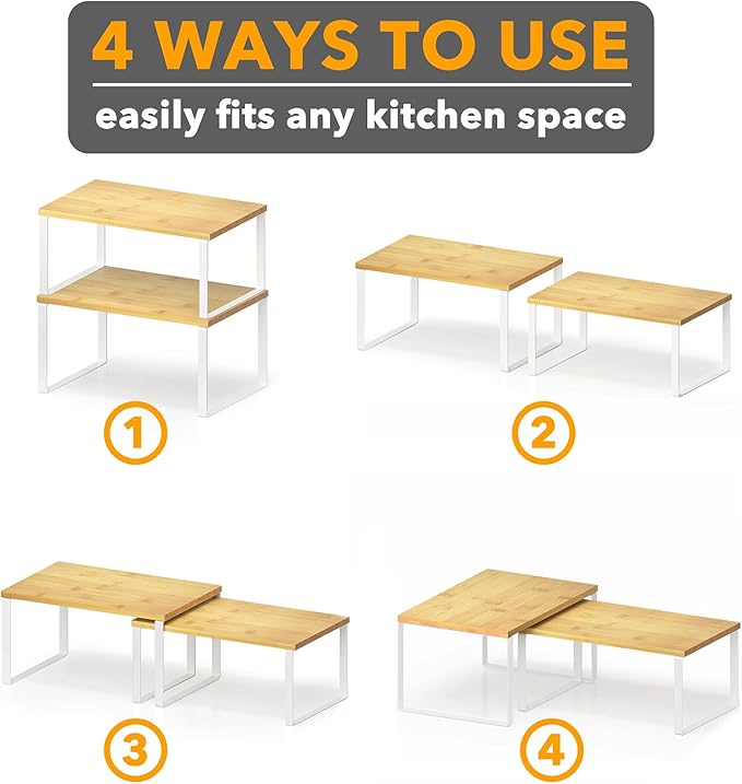- ADJUSTABLE AND STACKABLE - You can place the two shelves stacked, side by side, or in corner L shape to perfectly fit your different kitchen counter and cabinet space