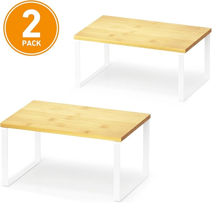 SpaceAid Cabinet Shelf Organizers 2 Pack, Kitchen Counter Rack Shelves Riser, Stackable Expandable Spice Rack, Pantry Cupboard Storage Organization (White and Natural, Short)