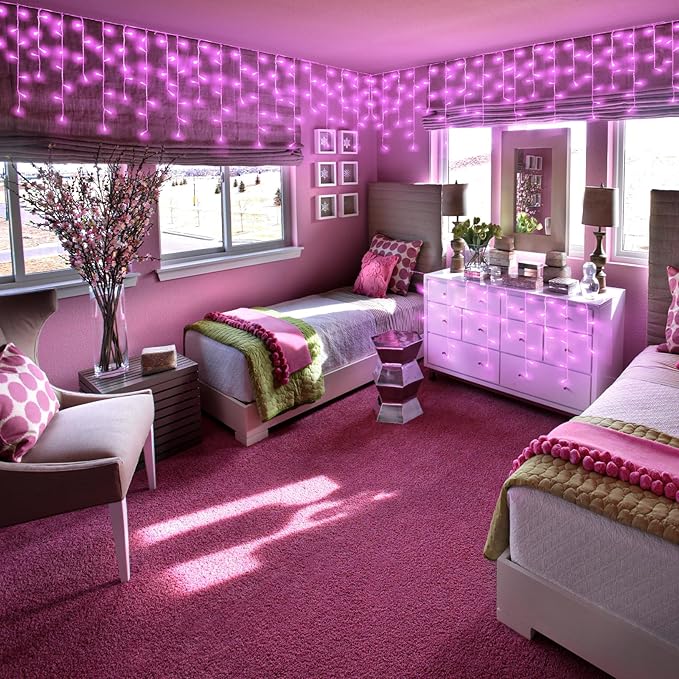 - Upgraded 8 Modes Icicle Lights for Outside: The pink Christmas Lights have 8 selections of light pattern: 1.Combination 2.In Waves 3.Sequential 4.Slo-Glo 5.Chasing/Flash 6.Slow Fade 7.Twinkle/Flash 8.Steady On. Different lighting effects are controlled by the button on the plug. These beautiful and vibrant outdoor Christmas lights will bring you a lot of festive atmosphere.