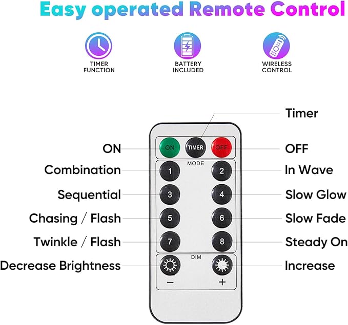 - Remote Control Convenience: Easily switch between 8 unique lighting modes and adjust brightness with the included remote; features timer for automatic 6 hours on, 18 hours off cycle.