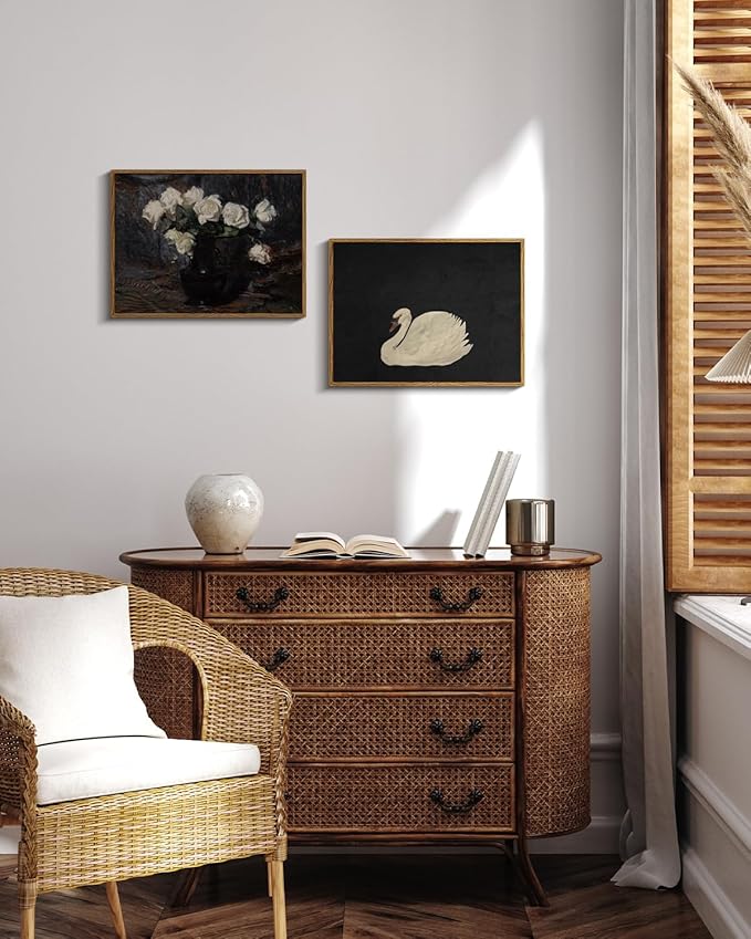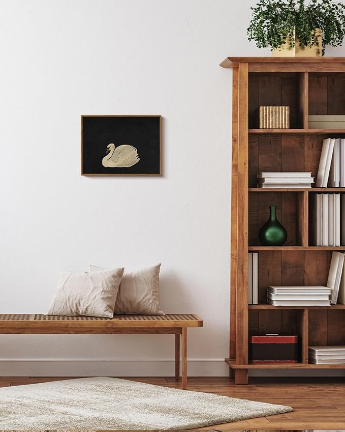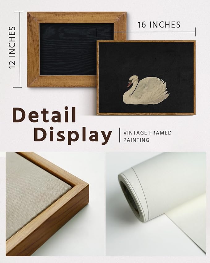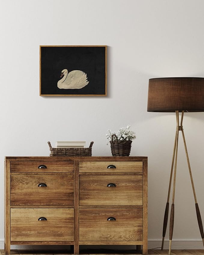 - VINTAGE SWAN OIL PAINTING: Elevate your living space with VIYYIEA swan art canvas wall decor. The swan is gracefully floating on a dark background that accentuates the purity and elegance. The frame around the swan wall art painting adds a sense of classic sophistication. The combination of the black and the luminous swan creates a striking contrast, highlighting the serene beauty of the bird, making it a timeless captivating piece.