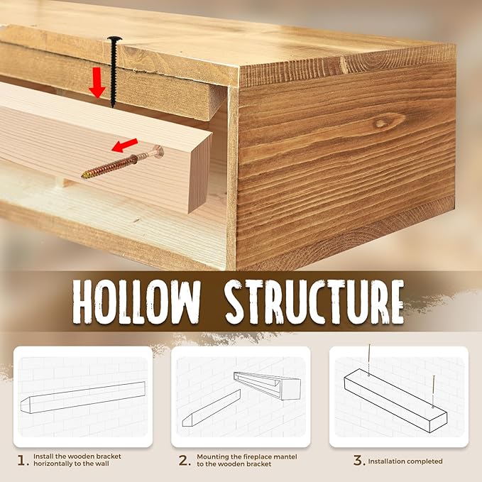 - Easy Installation: Our solid wood mantels come with hidden wood brackets, which can be easily fixed to the wall. Our hollow structure design ensures easy installation. The package includes installation instructions and two sets of accessories, compatible with hollow walls (drywalls) and solid walls (brick walls). For any installation issues, feel free to contact us at any time